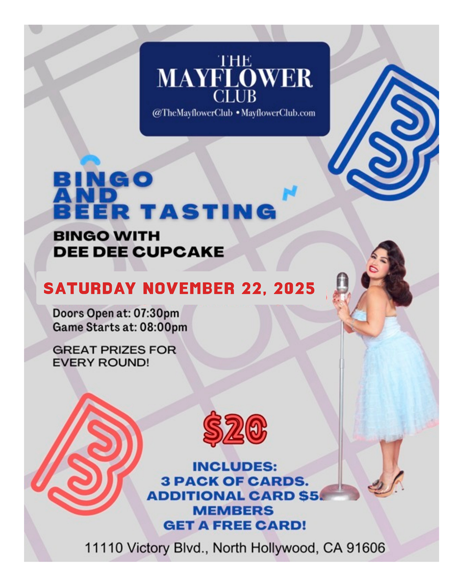 sat22nov7:30 pm9:00 pmBingo & Beer Tasting W/ Dee Dee Cupcake7:30pm | 3 Cards / $20 | Extra Cards $5 | Members get 1 Free Card